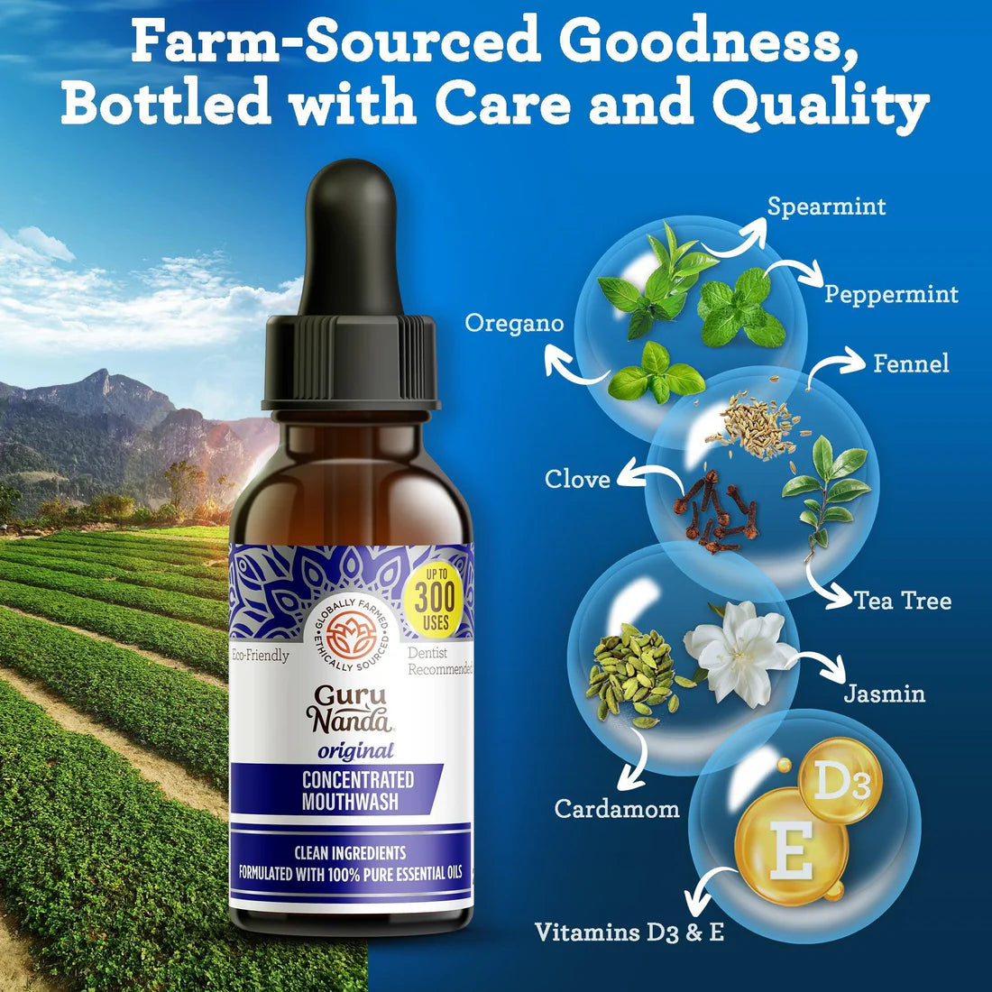 NATURAL BLEND OF ESSENTIAL OILS - Our unique blend of vitamins and essential oils supports effective oral care. Leaving your mouth clean and refreshed.